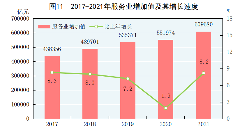 [17]战略性新兴服务业包括新一代信息技术产业、高端装备制造产业、新材料产业、生物产业、新能源汽车产业、新能源产业、节能环保产业和数字创意产业等八大产业中的服务业相关行业,以及新技术与创新创业等相关服务业。2021年战略性新兴服务业企业营业收入增速按可比口径计算。
